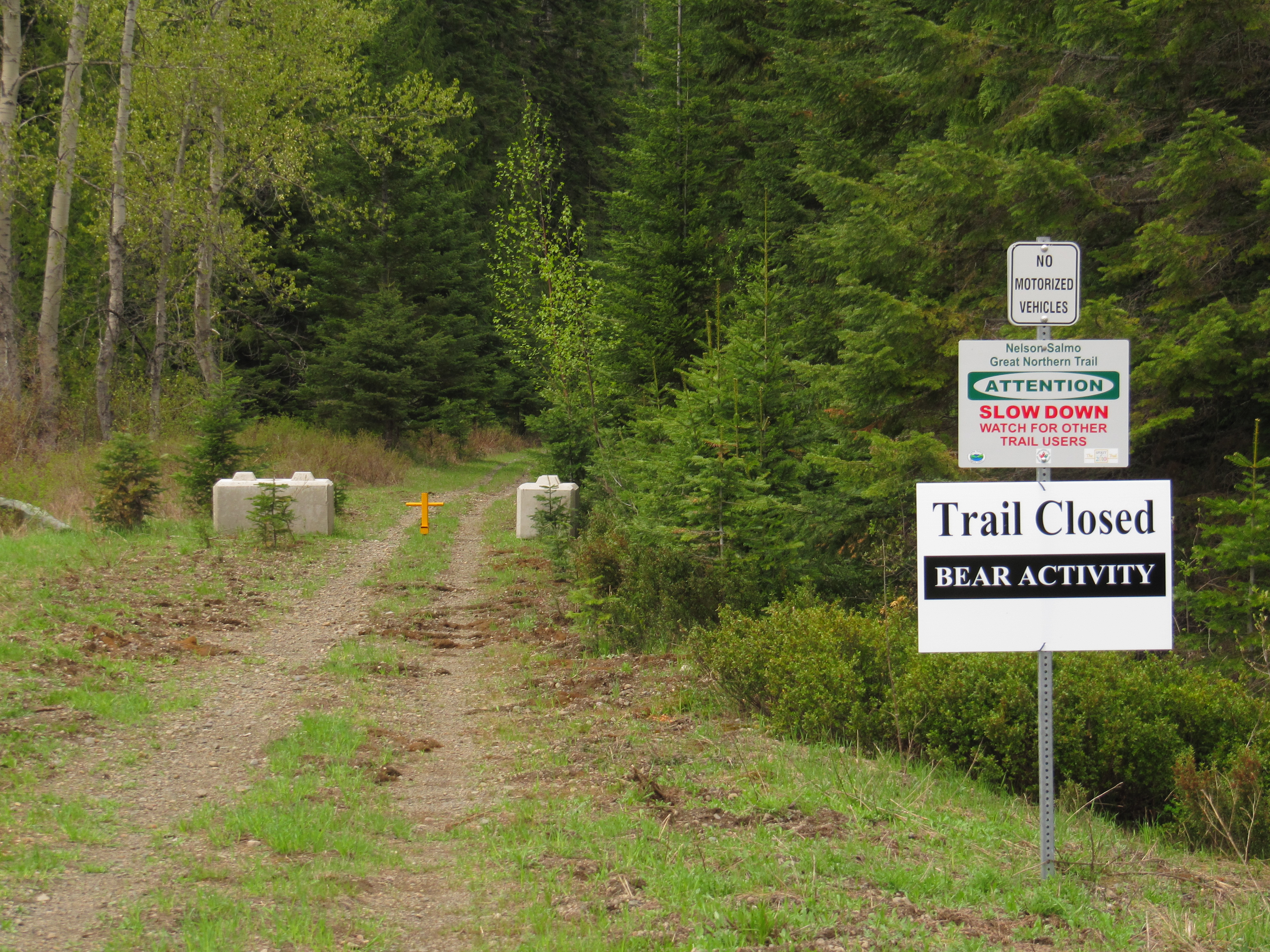 Ongoing, originally posted in 2013 -- Notice affecting the Salmo Area -- Annual closure in effect April 15 to June 15 (approx) -- Due to grizzly bear foraging each spring, the Salmo Great Northern rail trail is normally closed annually for 10 kilometres between Cottonwood Lake and Hall Siding (northern section, about 8 km south of Nelson) from mid April to mid June. The trail operator, the Regional District of Central Kootenay (RDCK), is responsible for this closure. Users are asked to use the highway as a bypass route when the closure is in effect. Read more on the Regional District's trail page. Note, the RDCK rarely (if ever) updates this webpage . Signs are posted along the trail when the closure is in effect, but the only other way to know if the closure is in effect is by contacting the RDCK directly; call their main switchboard at (250) 352-6665.